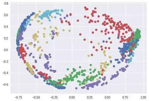 我使用 t-SNE 算法对 128 维度的嵌入空间进行二维可视化,并用每个颜色对应一个人员。如你所见,网络已经可以学着将图片进行尽可能紧密的分组。(使用 t-SNE 算法时,聚类间的距离已不再重要)。在使用 PCA 降维算法时还出现了一种有趣的分布。