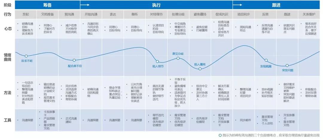 在有效沟通流程模型中,我按筹备、执行、跟进三个阶段,绘制出体验地图,将沟通中的关键节点按行为、心理、情绪、方法、工具五个纬度拆分,梳理各节点需注意的问题,以及相应的有效沟通方法和工具。(详情请点击查看大图)