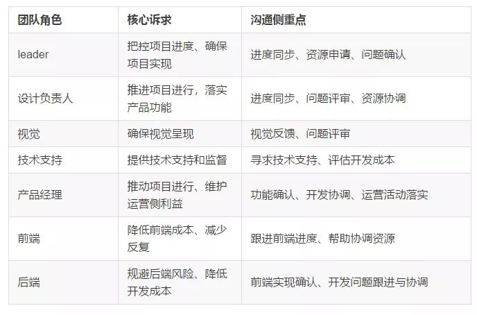 理解各方差异化的核心诉求——对不同团队角色的沟通中应有不同的侧重点,灵活的转换角色,做有针对性的输出表达。