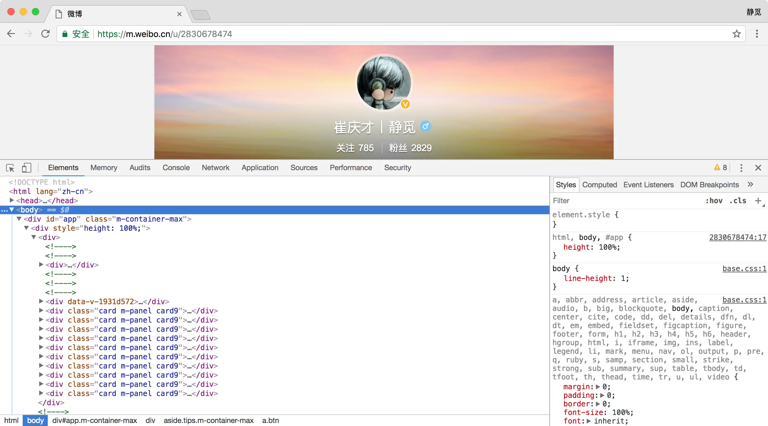 首先,用Chrome浏览器打开微博的链接m.weibo.cn/u/283067847…,随后在页面中点击鼠标右键,从弹出的快捷菜单中选择“检查”选项,此时便会弹出开发者工具,如图6-2所示: