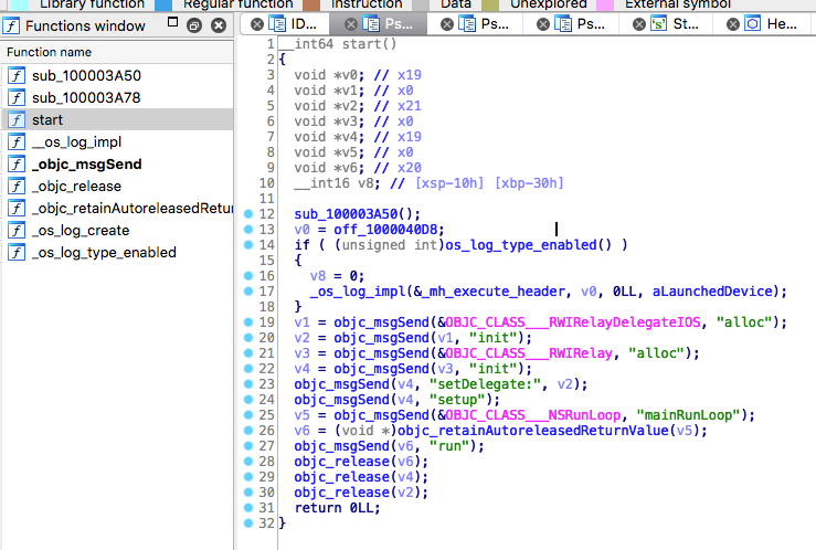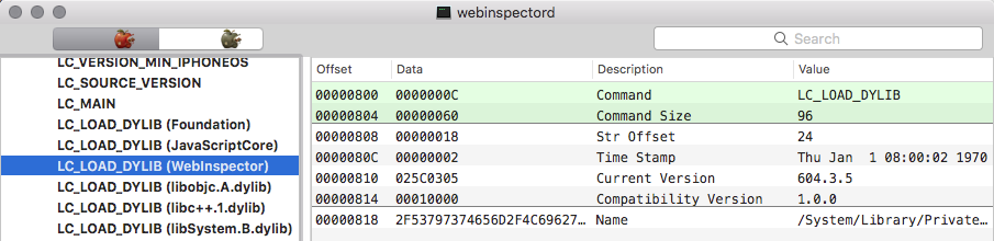 有同学反馈 10.0.2 没有 RWIRelayDelegateIOS 类,我验证了一下 10.0.3 的 IPSW 固件,函数是一样的。只不过直接编译到 webinspectord 而不是链接 WebInspector.framework。拆分链接库应该是 iOS 11 开始的。