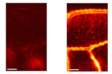 应用场景II:生物组织成像 左图:光声显微成像图像 右图:光声超分辨显微图像,细微的蜜蜂翅膀纹理清晰可见【5】