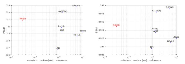图9 RAISR在2x上采样率时与SRCNN, A+等超分辨算法的技术指标对比