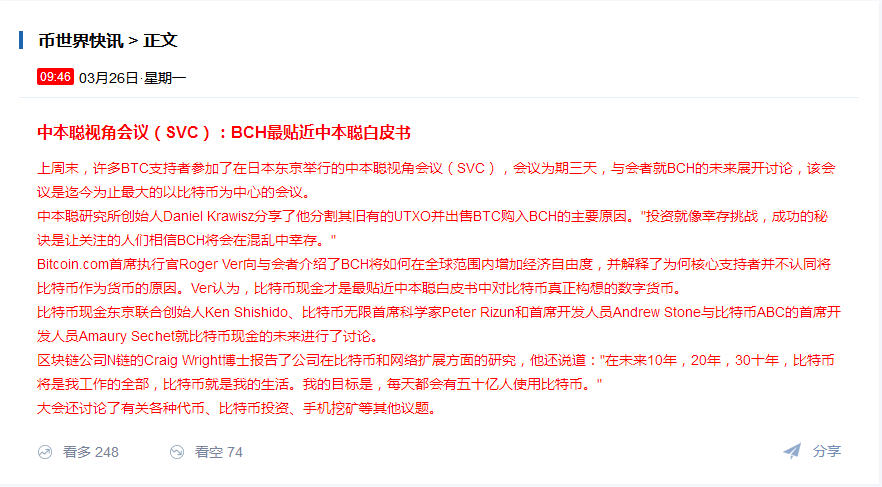 上周末,许多BTC支持者参加了在日本东京举行的中本聪愿景大会(SVC),会议为期三天,与会者就BCH的未来展开讨论,该会议是迄今为止最大的以比特币为中心的会议。 中本聪研究所创始人Daniel Krawisz分享了他分割其旧有的UTXO并出售BTC购入BCH的主要原因。"投资就像幸存挑战,成功的秘诀是让关注的人们相信BCH将会在混乱中幸存。"