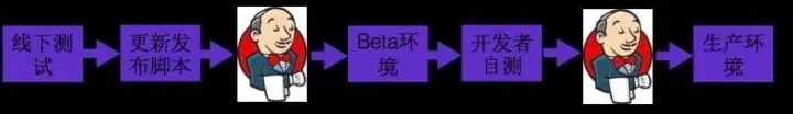 开发者拿到服务器准备线上发布时用 Jenkins 触发脚本的方式:用 Jenkins 的脚本做测试,执行代码推送。当需要新加一台服务器或者下线一台服务器,要去修改这个发布脚本。 发布流程大概是这样的:Jenkins 脚本先往 beta 环境发,开发者在 beta 环境里做自测,自测环境没有问题就全量发。