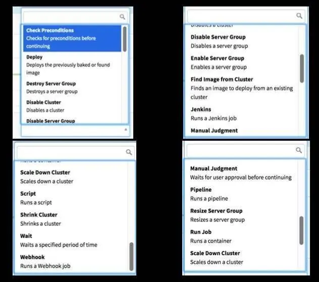 图 8 是 Pipeline 步骤的类型。左上 Check Precondltions 前置条件满足的时候才执行某个步骤。例如当前面的第一次发布里所有的实例都存活的时候,才执行某个步骤。或者当前面的步骤达到了某个状态,再执行下一个步骤。deploy 是在 Kubernetes 环境里生成 Replication Set,可以在 deploy 里更新一个服务器组、禁用一个集群、把集群的容量往下降、往上升等等。也可以跑某一个脚本,这个脚本是在某一个容器里,有时候可能有这样的需求,比如说 Java 来说这个 Java 跑起来之后并不是马上能够接入流量,可能要到 Java 里跑一个 job,从数据库加载数据并做些初始化工作后,才可以开始承接流量。