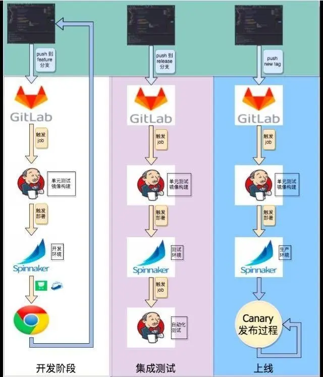 开发阶段,开发者在迭代开始时生成一个 Feature 分支,以后的每次更新都将这个 Feature 分支推送到 GitLab 。GitLab 里配置的 Webhook 触发一个 Jenkins job,这个 job 做单元测试和镜像构建,构建成一个 Feature 分支的镜像,给这个镜像一个特定的 tag。生成新的镜像之后,触发 Spinnaker 的部署,这个部署只在开发环境里。