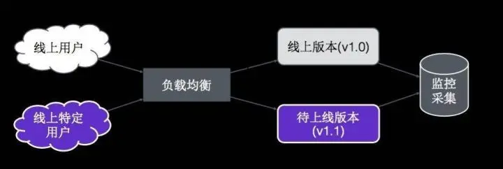 这个是 Canary 的示意图,线上用户被分成两组,大部分用户访问老版本,特定用户通过负载均衡转发到特定的版本里,后台有监控数据方便去比较两个版本之间的差异。