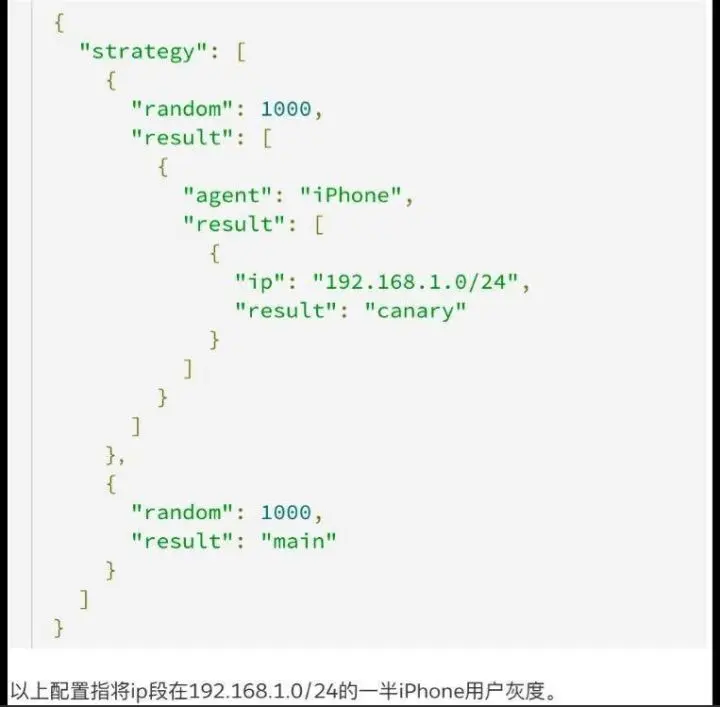 图上(图 19)是我们的 Canary 策略。这是我们自己实现的一套东西。图中的例子是把来自指定网段一半的 iPhone 用户进行 Canary。用户分组的维度还可以有其它规则,现在我们支持的是完全随机/特定 IP/特定设备类型,这些规则可以组合起来。