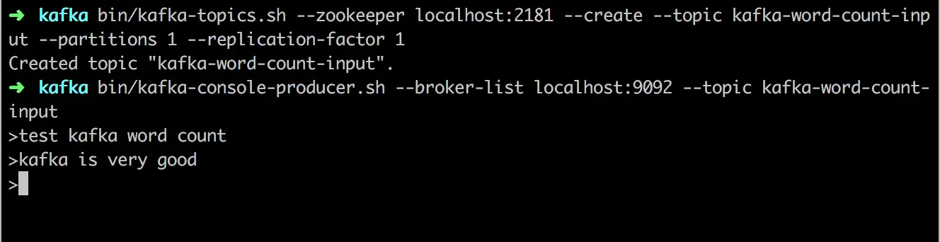 bin/kafka-topics.sh --zookeeper localhost:2181 --create --topic kafka-word-count-input --partitions 1 --replication-factor 1
