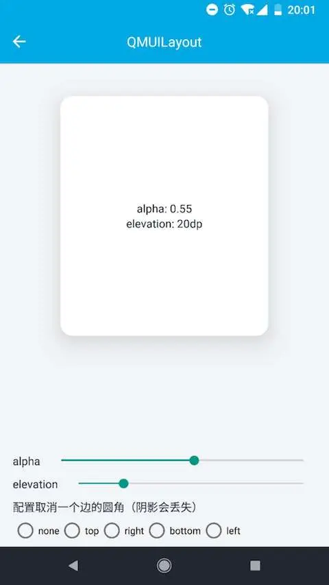 其实原理很简单,利用 android 5.0 后提供的 elevation 来实现的, 大多数人通过阅读官方文档或者别人的教材,了解了 elevation 可以控制 shadow 的大小,但是很少人知道 shadow 还会被另外一个因素所控制:outline 的 alpha。 有了这两个因素,可以更精确的控制 shadow 的深浅,能无限接近设计师的阴影要求,当然,除了阴影颜色,那是 QMUILayout 所不能控制的。