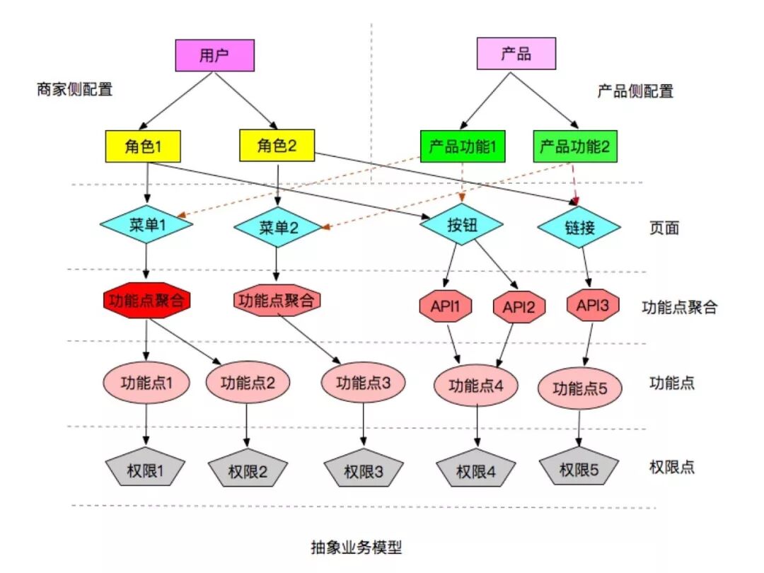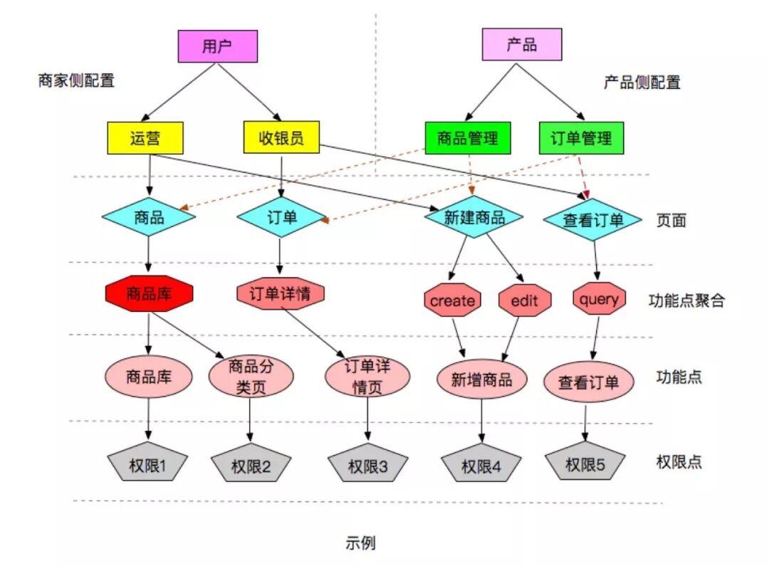 产品在分析完需求后,将需求交由开发去完成。SAM 权限系统支撑着零售业务的同时,也支撑着微商城业务。 零售各个模块就有不同的产品支撑着,为了更好的满足服务商家的需求,以及方便产品们的分析。SAM 权限系统可以抽象成如下模型,商家和产品可以从各自不同的视角,去对接 SAM 权限系统。例如,下图所示商家想要一个运营的角色需要有新建商品,以及查看订单的能力,同时需要一个收银员只有查看订单的能力。产品从自己的设计角度分析,对应的就是商品管理,订单管理的模块,对应的模块下有对应的商品,订单菜单,最后将角色的权限体现在页面元素和 API 上,例如新建商品的按钮,以及查看订单的按钮会呈现不同的渲染样式;按钮触发对应的是与后端交互的不同 API,不同的角色具有 API 的不同执行能力。