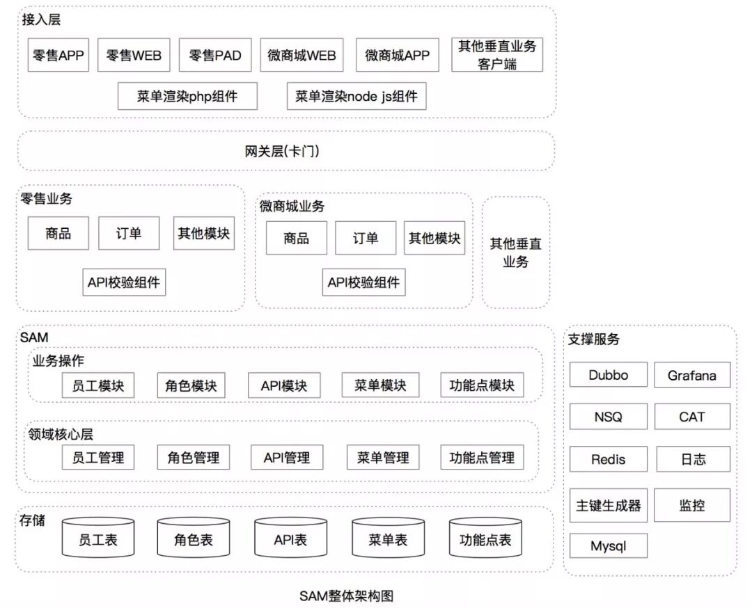 零售通过 PC、App 和 Pad 来满足不同商家的终端需求,因此 SAM 权限系统需要满足零售不同客户端权限业务场景,同时也要支持微商城产品权限业务。SAM 权限系统采用微服务的方式对外提供服务,采用分布式分层架构实现,主要包括客户端和服务端两部分,客户端以轻量的方式嵌入在业务系统,提供给不同业务系统实现角色访问资源的控制;服务端通过提供 Dubbo 服务,Nova 服务跟客户端进行交互。服务端主要对员工,菜单,角色,API,功能点进行数据管理。SAM 作为基础服务,每天的请求量巨大,通过 Redis 缓存来解决性能问题,选用 Druid 作为数据库连接池,管理着数据库的连接以及释放。同时,通过对接天网监控平台来观察系统运行状态,提高系统的稳定性。