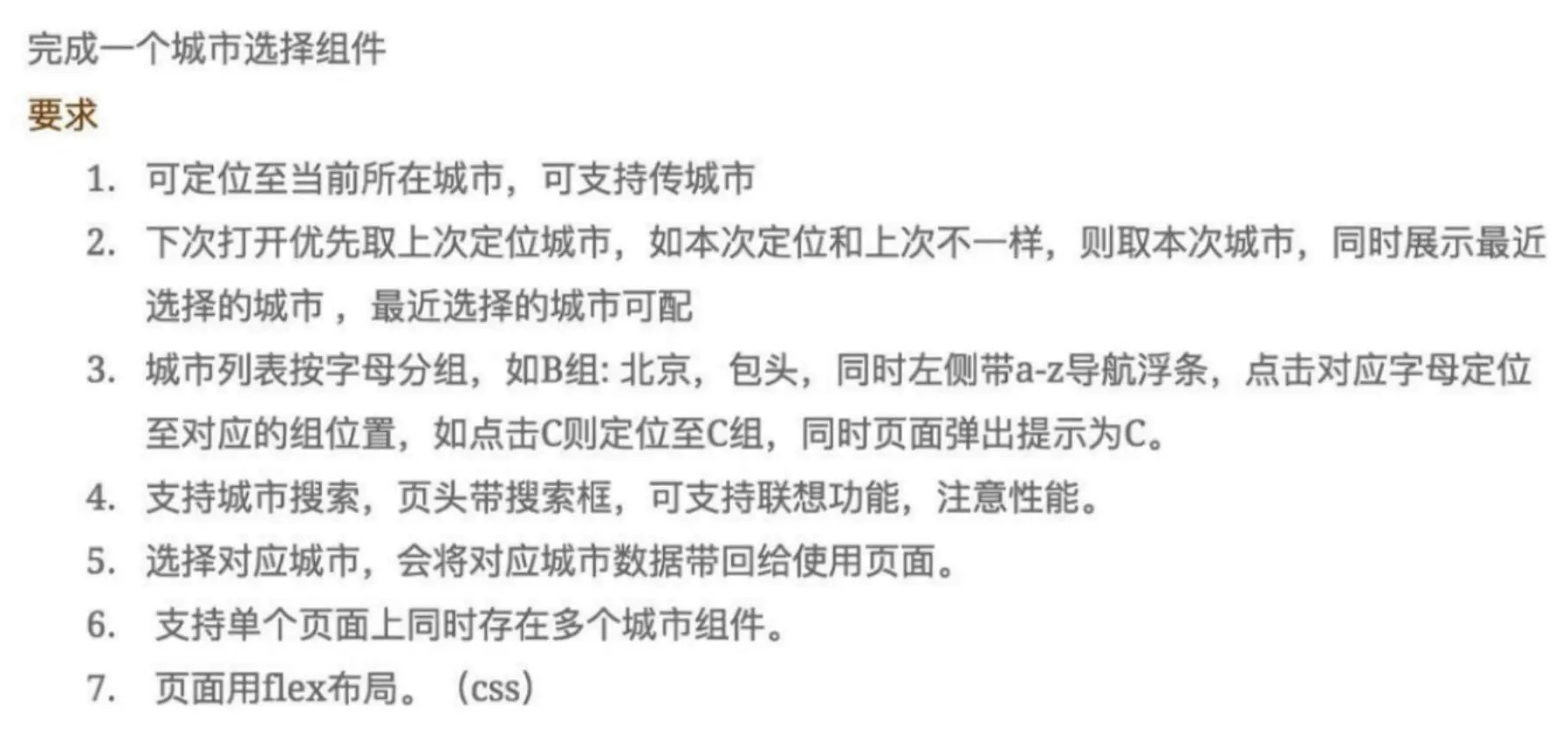 大概就是这样吧,分析一下就是做一个城市选择组件,实现的功能或者要求呢就是可以定位当前的城市、用localstorage存储上次定位的城市和最近选择过的城市、可以按照输入的字母或者文字筛选出想找的城市、将数据带到页面也就是一个父子传参的问题吧、页面使用flex布局。