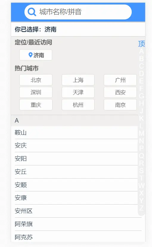 感觉写的脑袋疼,这个城市选择组件的形式被应用于各种app和网站,是继省市二级联动之后城市选择功能的实现形式。逻辑颇多,大多在上面被提到。