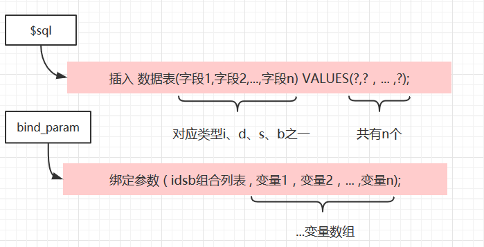 //$mysql为数据库句柄$stmt = $mysqli->stmt_init(); $sql = "INSERT INTO Student(name,grade) VALUES(?,?);";$stmt->prepare($sql);$stmt->bind_param('is',$name,$grade);$result = $stmt->execute();