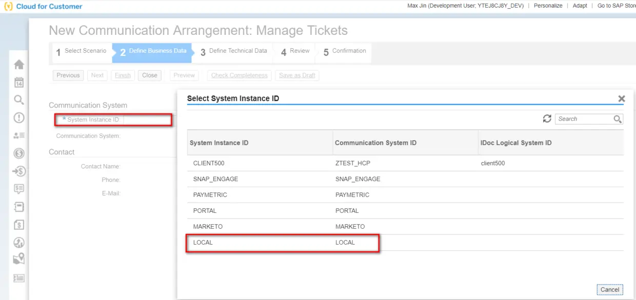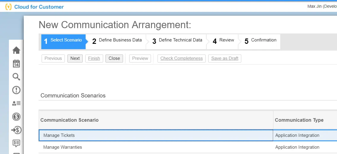 基于Manage Tickets这个标准的Communication Scenario创建一个Communication Arrangement: