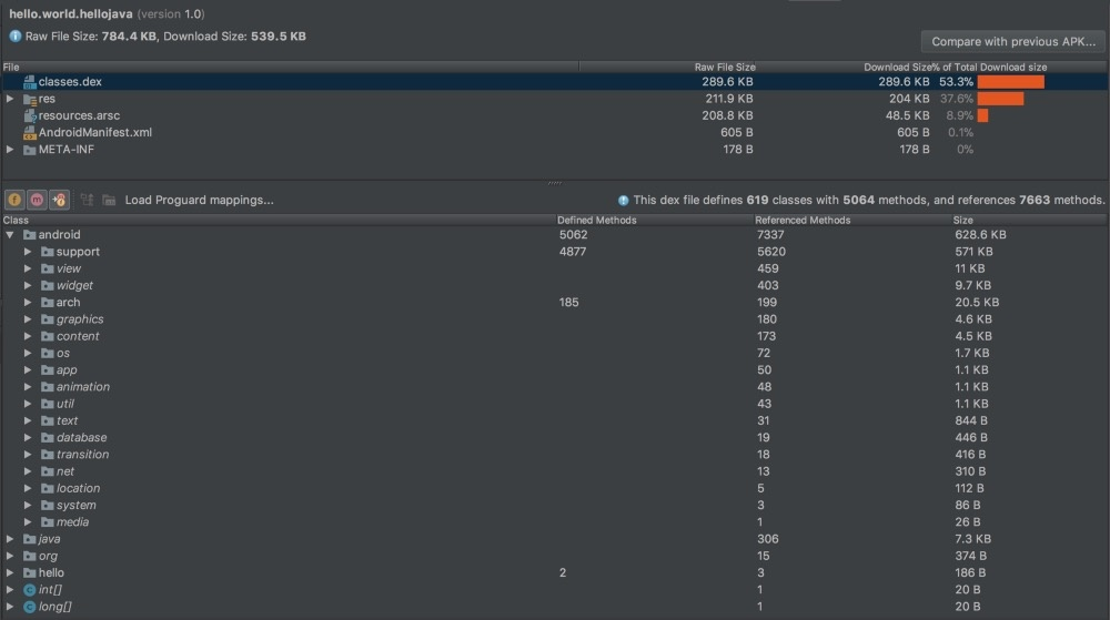 首先使用 Java 来开始这次实验,使用 Java 开发 Android 算是最常规也是最简单的一种方式。正如前面描述的那样,由于我们仅仅使用了 Java 和 Android 框架来创建这个应用程序,所以它将是最小的,唯一的依赖是 Android 支持库,在这里你可以看到它占用了整个 Apk 内相当多的空间。