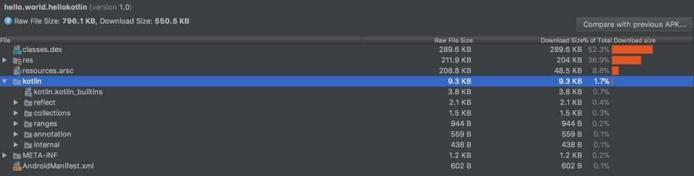 接下来,我们使用 Kotlin。如果你使用 Java 编写过很长一段时间的代码,我想 Kotlin 应该会让你眼前一亮。Kotlin 应用程序的 Release 版本,包含了我们在 Java APK 中能看到的所有内容,以及一些基于 Kotlin 的语法糖信息。