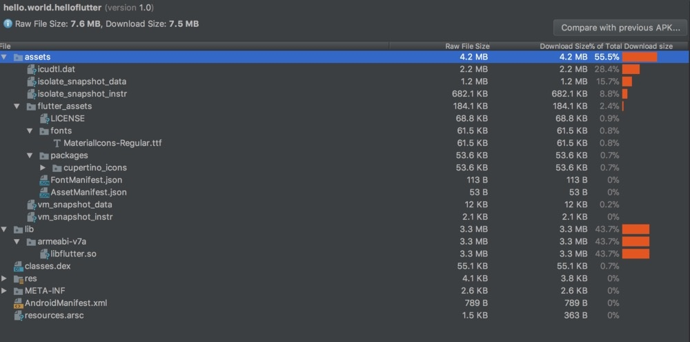 由 Flutter 的 cli 生成的 Release 版本的应用程序中,包含 C / C ++ 引擎和 Dart VM,它们构成了 Apk 的几乎所有部分。该应用程序直接使用本机指令集运行,不涉及任何解释器。