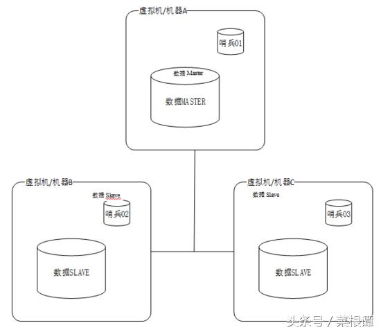 这里给出一个哨兵的通用部署方案。哨兵节点一般至少要部署3份,可以和被监控的节点放在一个虚拟机中,常见的哨兵部署如图所示。