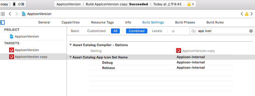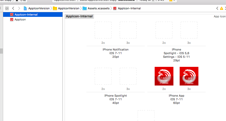 注意: 按照实际生成AppIcon资源文件名修改 6. 运行 Xcode 工程,自动生成一套,名为AppIcon-Internal,含有覆盖信息的App图标资源文件。