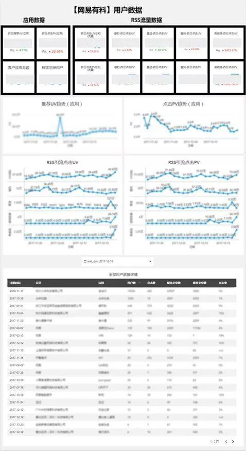 在网易有料项目中,项目数据通过BI分析工具网易有数来进行呈现和同步。将数据拆分为不同的方面如核心数据、用户数据、运营数据、内容数据等,以不同频率(如每天、每周、每月等)同步至不同的相关角色,同时相关同事也会定期/不定期地同步数据分析的相关结论。数据报表的样例如下: