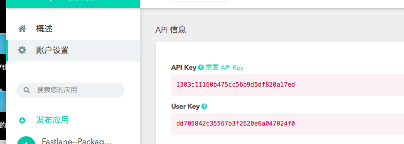 - pgyer(api_key: "1303c11160b475cc56b9d5df820a17ed", user_key: "dd705842c35567b3f2620e6a047024f0"), 在蒲谷英开发平台配置中查看