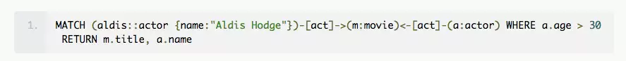 下面,我们介绍 RedisGraph 中的模块在执行查询中的操作步骤。以下面的查询为例,该查询找出所有 30 岁以上并与 Aldis Hodge 共同参演过影片的演员: