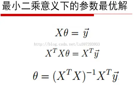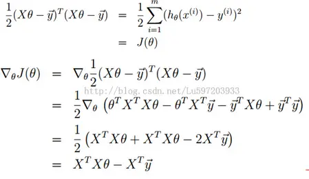 为了便于理解,可以先看当数据集中的样本只有一个特征时的情况,参看之前的最小二乘法博文,可以直接得出theta的值(原先博文中表示为beta)。当含有多个特征时,需要进行矩阵计算从而求出各个θi:
