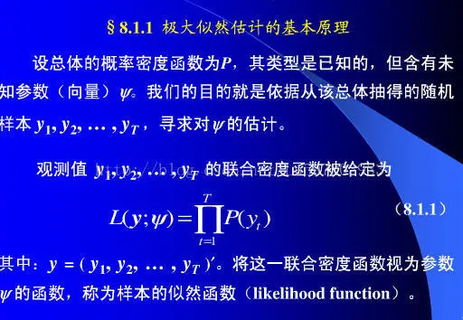 当从模型总体随机抽取n组样本观测值后,最合理的参数估计量应该使得从模型中抽取该n组样本观测值的概率最大。打个比方:一个袋子中有20个球,只有黑白两色,有放回的抽取十次,取出8个黑球和2个白球,计算袋子里有白球黑球各几个。那么我会认为我所抽出的这个样本是被抽取的事件中概率最大的。p(黑球=8)=p^8*(1-p)^2,让这个值最大。极大似然法就是基于这种思想。