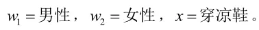 我们来看一个直观的例子:已知:在夏季,某公园男性穿凉鞋的概率为1/2,女性穿凉鞋的概率为2/3,并且该公园中男女比例通常为2:1,问题:若你在公园中随机遇到一个穿凉鞋的人,请问他的性别为男性或女性的概率分别为多少?