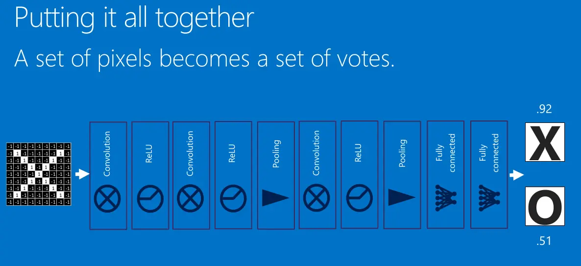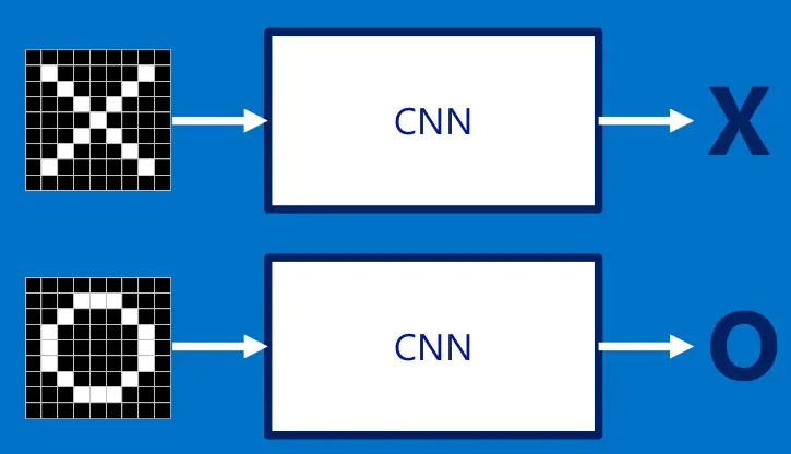 这个例子足够说明CNN背后的原理,同时它足够简单,能够避免陷入不必要的细节。在CNN中有这样一个问题,就是每次给你一张图,你需要判断它是否含有"X"或者"O"。并且假设必须两者选其一,不是"X"就是"O"。理想的情况就像下面这个样子: