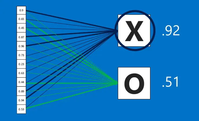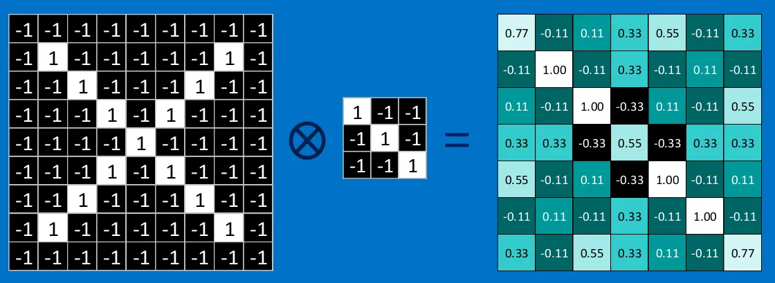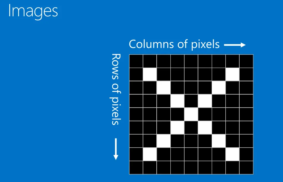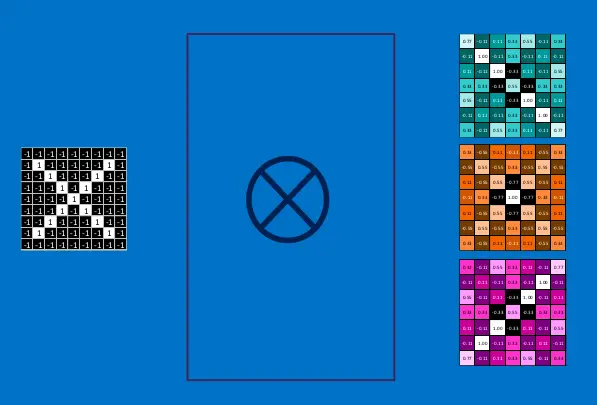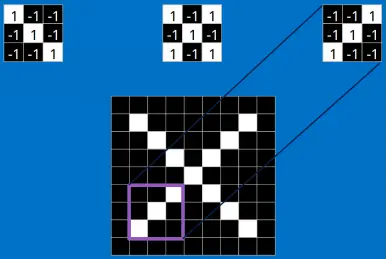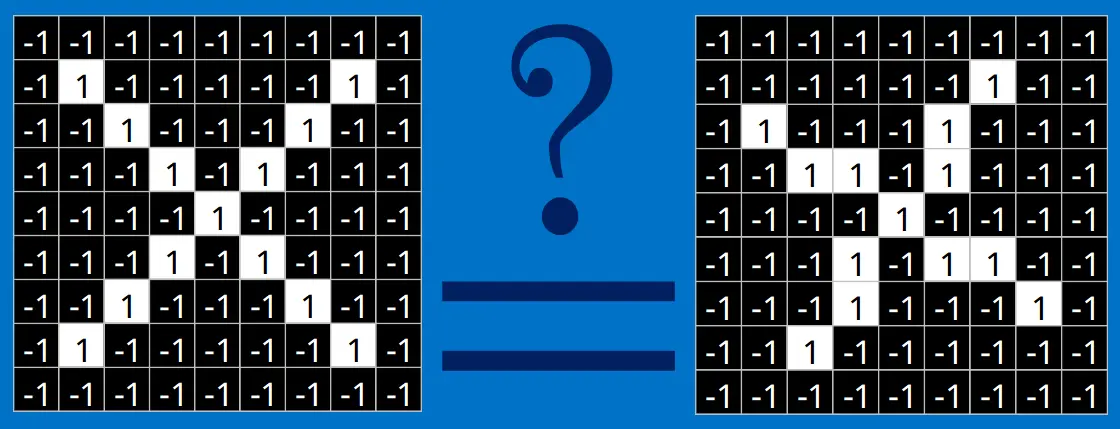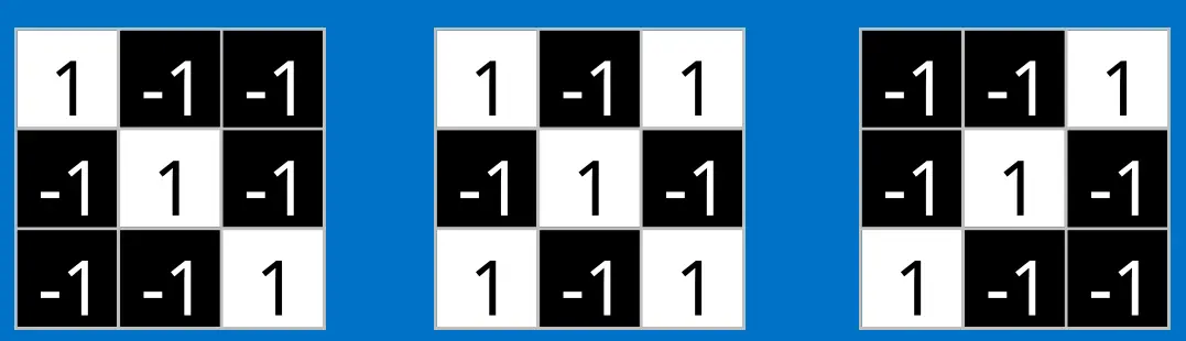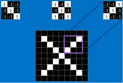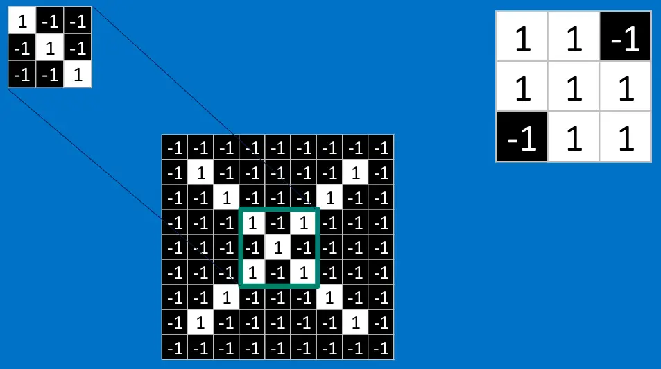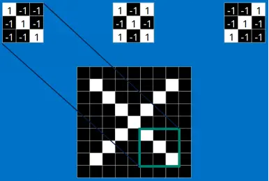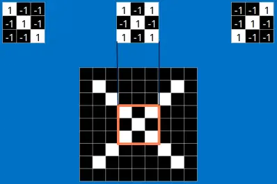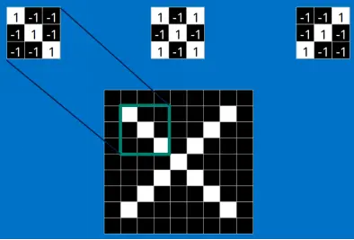 计算机要解决上面这个问题,一个比较天真的做法就是先保存一张"X"和"O"的标准图像(就像前面给出的例子),然后将其他的新给出的图像来和这两张标准图像进行对比,看看到底和哪一张图更匹配,就判断为哪个字母。但是这么做的话,其实是非常不可靠的,因为计算机还是比较死板的。在计算机的“视觉”中,一幅图看起来就像是一个二维的像素数组(可以想象成一个棋盘),每一个位置对应一个数字。在我们这个例子当中,像素值"1"代表白色,像素值"-1"代表黑色。