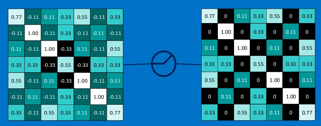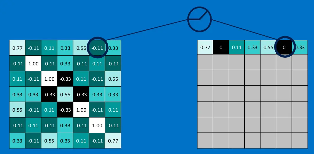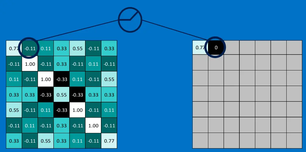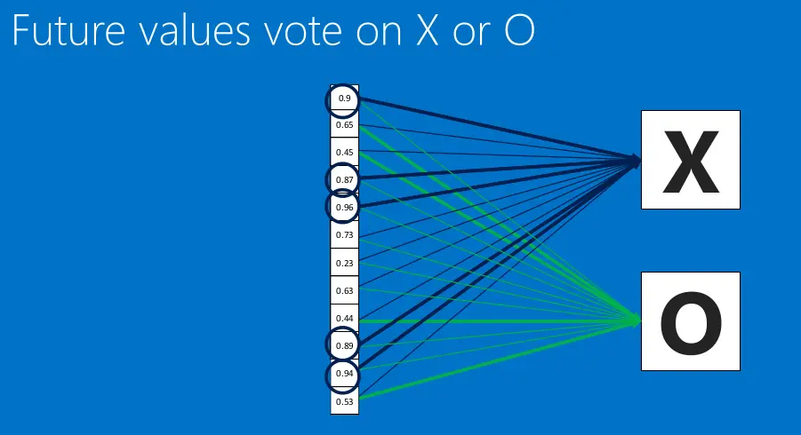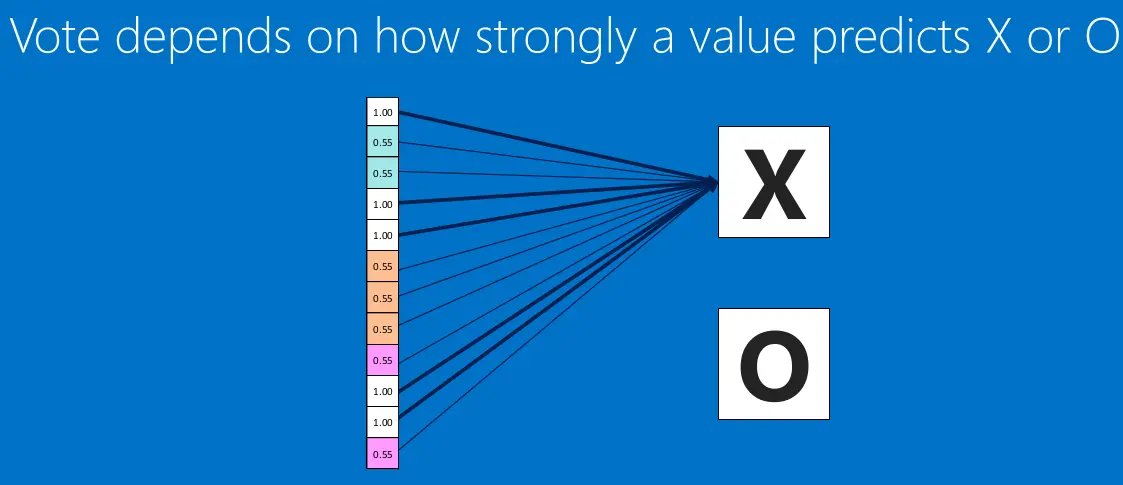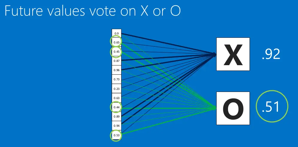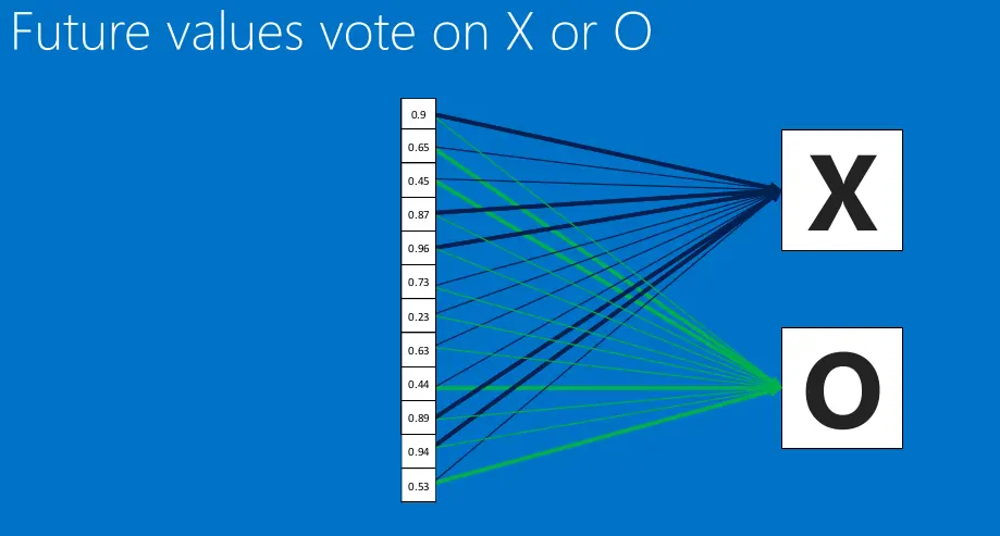计算机要解决上面这个问题,一个比较天真的做法就是先保存一张"X"和"O"的标准图像(就像前面给出的例子),然后将其他的新给出的图像来和这两张标准图像进行对比,看看到底和哪一张图更匹配,就判断为哪个字母。但是这么做的话,其实是非常不可靠的,因为计算机还是比较死板的。在计算机的“视觉”中,一幅图看起来就像是一个二维的像素数组(可以想象成一个棋盘),每一个位置对应一个数字。在我们这个例子当中,像素值"1"代表白色,像素值"-1"代表黑色。