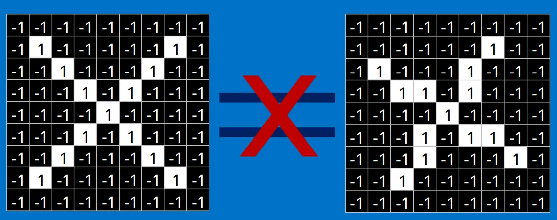 因此,从表面上看,计算机判别右边那幅图不是"X",两幅图不同,得出结论: