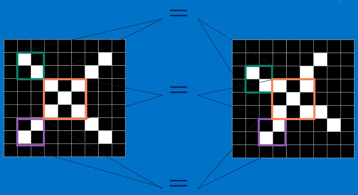 当比较两幅图的时候,如果有任何一个像素值不匹配,那么这两幅图就不匹配,至少对于计算机来说是这样的。 对于这个例子,计算机认为上述两幅图中的白色像素除了中间的3*3的小方格里面是相同的,其他四个角上都不同: