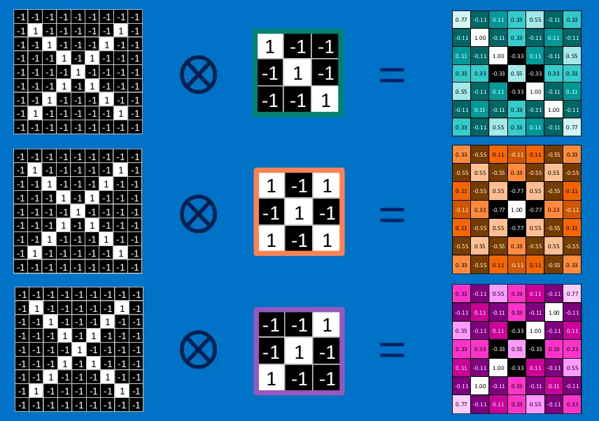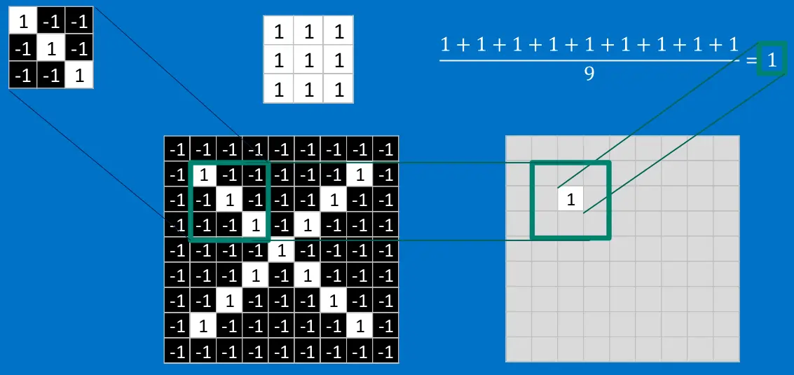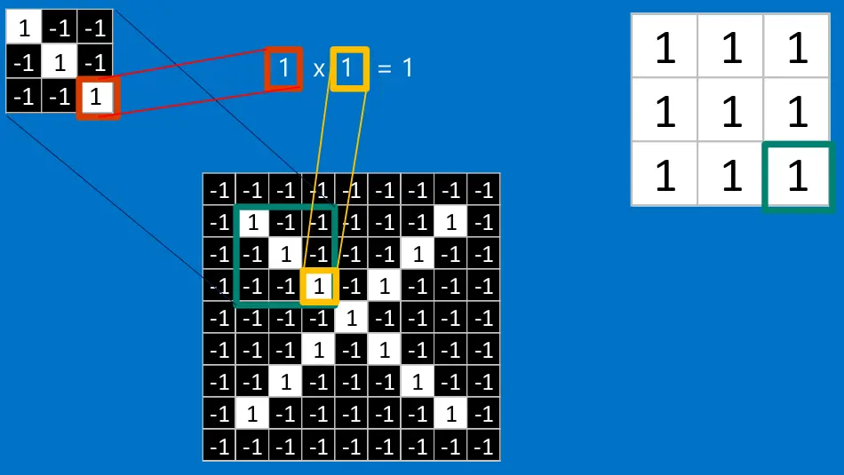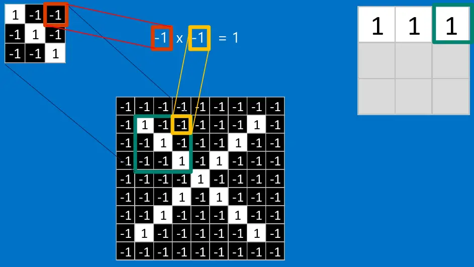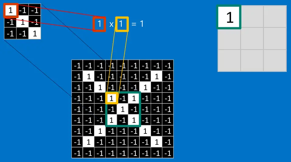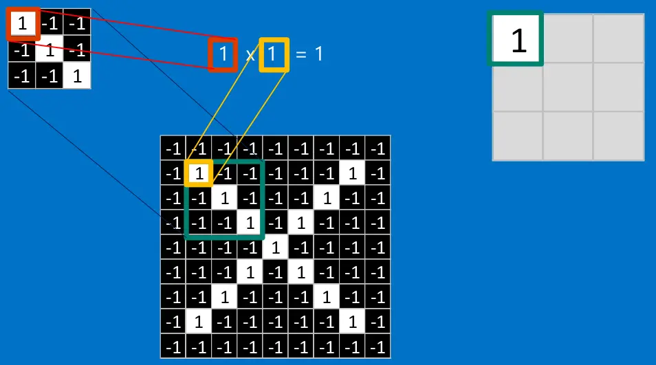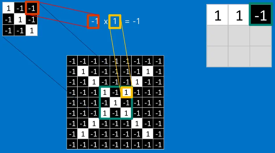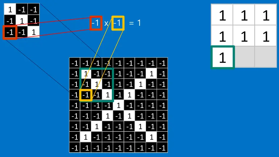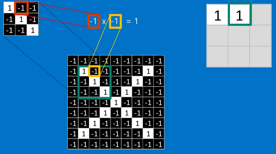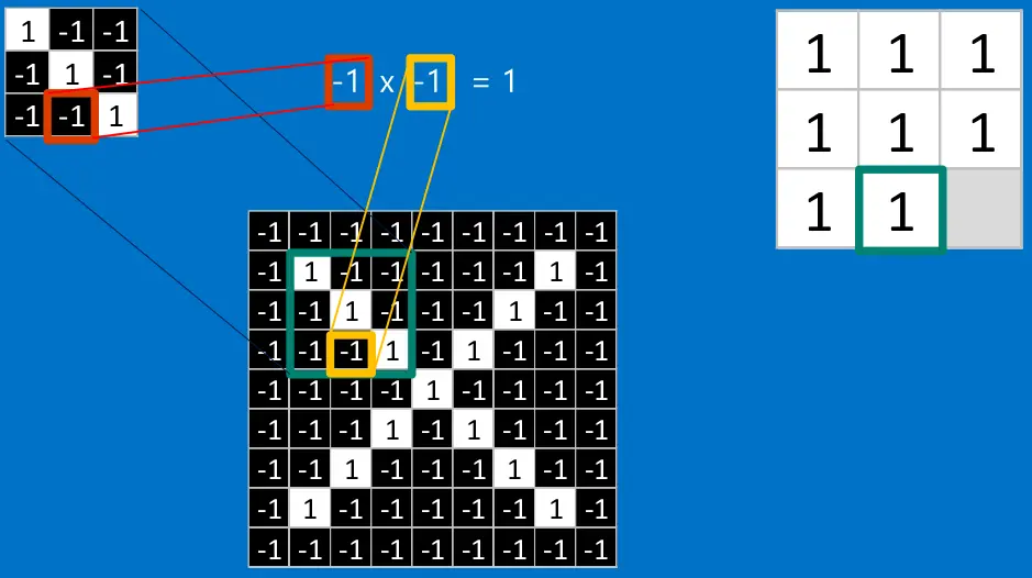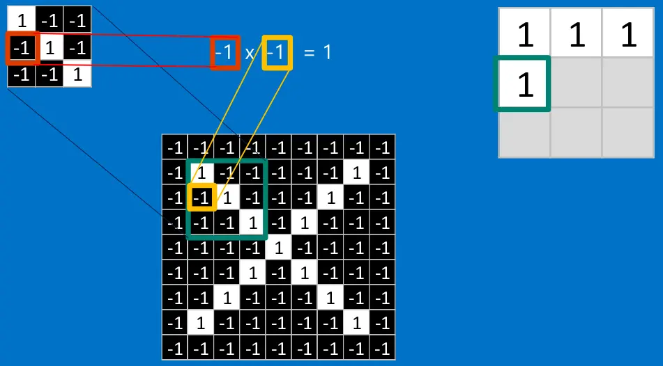 这个卷积操作背后的数学知识其实非常的简单。要计算一个feature和其在原图上对应的某一小块的结果,只需要简单地将两个小块内对应位置的像素值进行乘法运算,然后将整个小块内乘法运算的结果累加起来,最后再除以小块内像素点总个数即可。如果两个像素点都是白色(也就是值均为1),那么1*1 = 1,如果均为黑色,那么(-1)*(-1) = 1。不管哪种情况,每一对能够匹配上的像素,其相乘结果为1。类似地,任何不匹配的像素相乘结果为-1。如果一个feature(比如n*n)内部所有的像素都和原图中对应一小块(n*n)匹配上了,那么它们对应像素值相乘再累加就等于n2,然后除以像素点总个数n2,结果就是1。同理,如果每一个像素都不匹配,那么结果就是-1。具体过程如下: