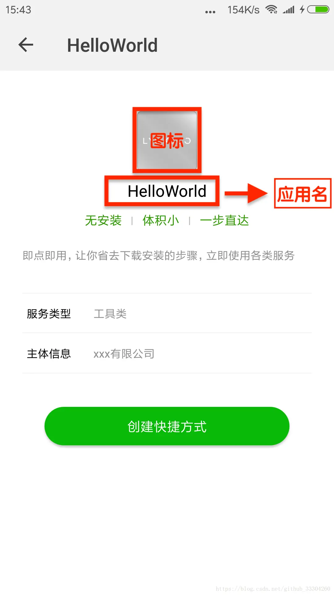 应用名称,6个汉字以内,与应用商店保存的名称一致;框架提供保存到桌面的功能,桌面上显示的应用名即为此属性