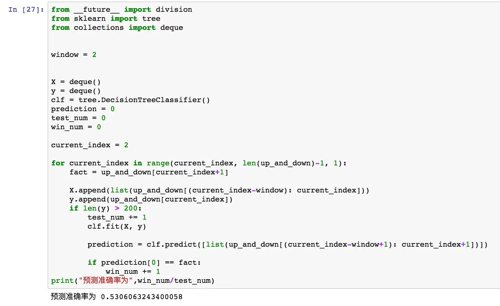 这样跑下来,我们的预测正确率为53%,实际上这个结果我认为还是有一定道理的,如果行情连续两天都在涨,那么第三天最后是涨的情况可能确实要多一些。