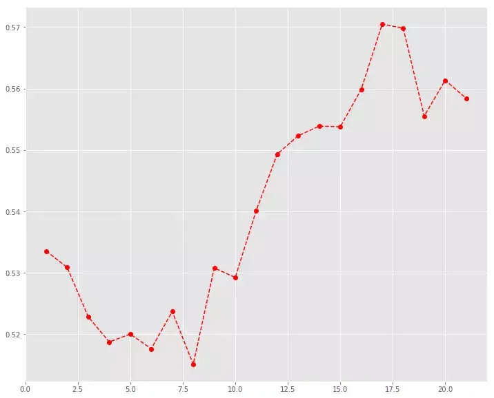 结果非常有趣,我们发现,窗口期从8开始,预测的正确率呈现出一个比较明显的上扬趋势,甚至在window为17天的时候,正确率达到惊人的百分之57。