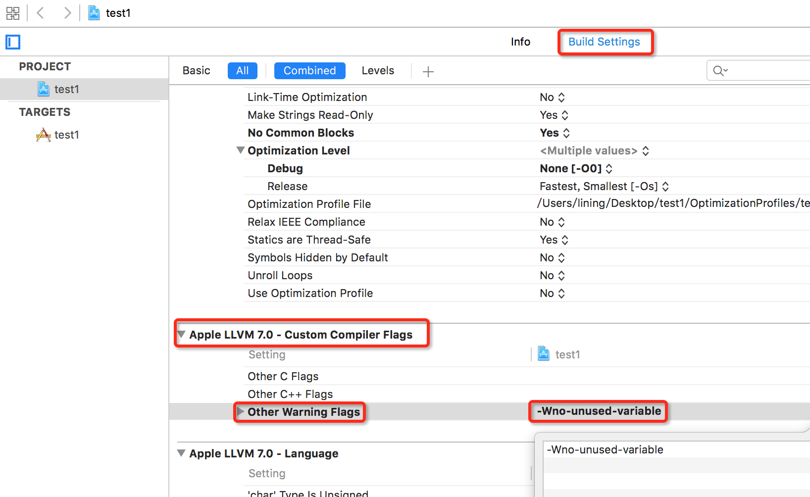 还是上面的例子,在 Build Settings 中找到 Custom Compiler Flags,双击 Other Warning Flags(可以配置 Debug 和 Release 环境),填入 -Wno-unused-variable,完成后,编译项目,项目中所有的此类型警告都没有了。