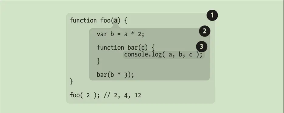 - 包含着 foo 所创建的作用域,其中有三个标识符: a 、 - bar 和 b 。