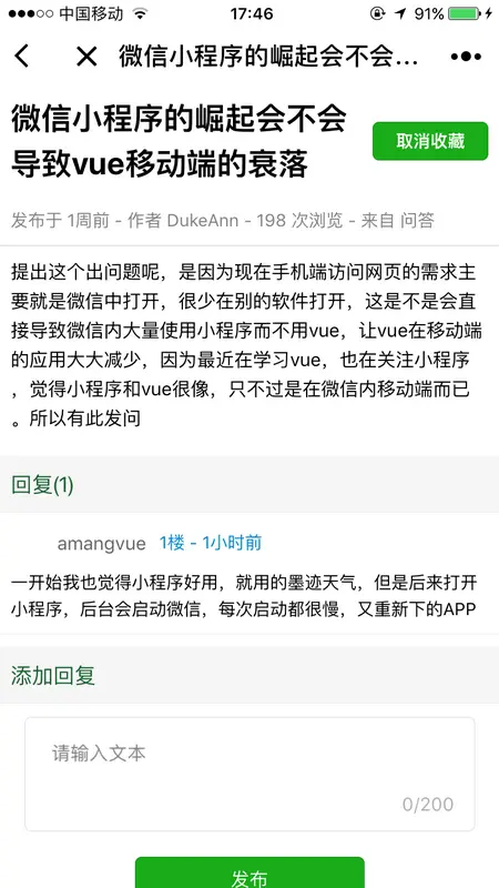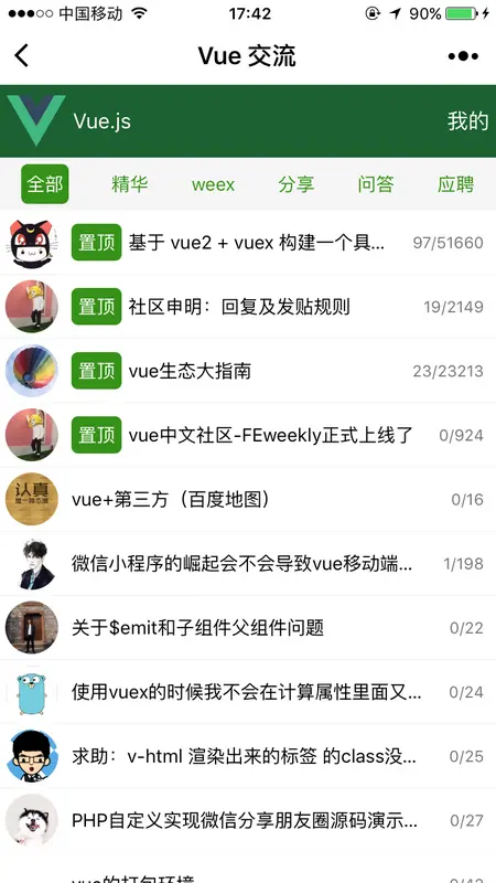 小程序的秉承着 “体验极简化”、“用完即走” 的理念应运而生。许久之前,我就对小程序的个人版的推出满怀期待,想做点小玩意儿体验一下小程序,而后又忙于工作,没有付诸行动,如今在找工作期间得闲,花了4天,基于Vue.js中文论坛提供的开发接口,开发了论坛的小程序版。