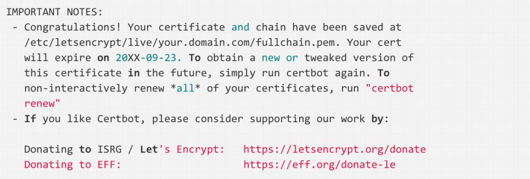 sudo certbot certonly --webroot -w /usr/share/nginx/html/ -d your.domain.com ,后面的域名要替换成你自己的。