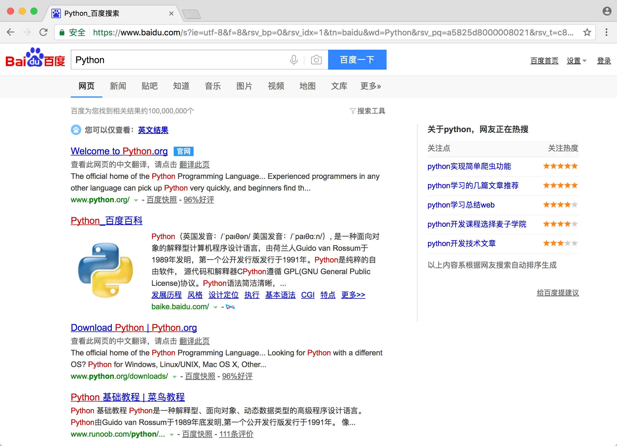 from selenium import webdriverfrom selenium.webdriver.common.by import Byfrom selenium.webdriver.common.keys import Keysfrom selenium.webdriver.support import expected_conditions as ECfrom selenium.webdriver.support.wait import WebDriverWait browser = webdriver.Chrome()try: browser.get('https://www.baidu.com') input = browser.find_element_by_id('kw') input.send_keys('Python') input.send_keys(Keys.ENTER) wait = WebDriverWait(browser, 10) wait.until(EC.presence_of_element_located((By.ID, 'content_left'))) print(browser.current_url) print(browser.get_cookies()) print(browser.page_source)finally: browser.close()运行代码后发现,会自动弹出一个Chrome浏览器。浏览器首先会跳转到百度,然后在搜索框中输入Python,接着跳转到搜索结果页,如图7-1所示。