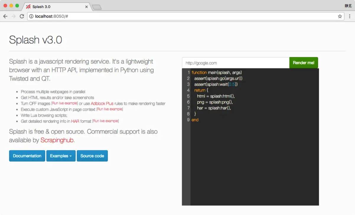 123456789function main(splash, args) assert(splash:go(args.url)) assert(splash:wait(0.5)) return { html = splash:html(), png = splash:png(), har = splash:har(), }end这个脚本实际上是用Lua语言写的脚本。即使不懂这个语言的语法,但从脚本的表面意思,我们也可以大致了解到它首先调用go()方法去加载页面,然后调用wait()方法等待了一定时间,最后返回了页面的源码、截图和HAR信息。