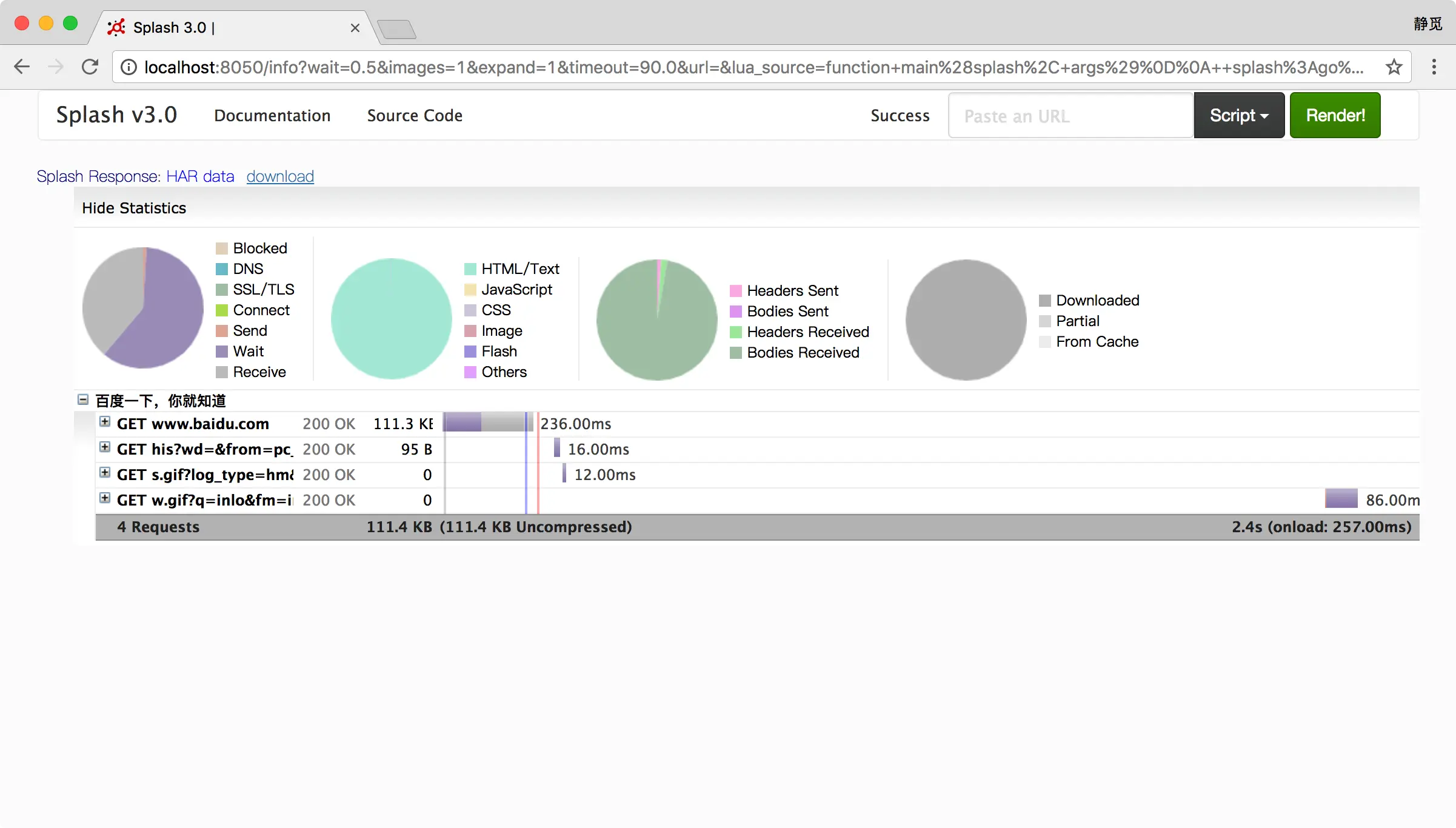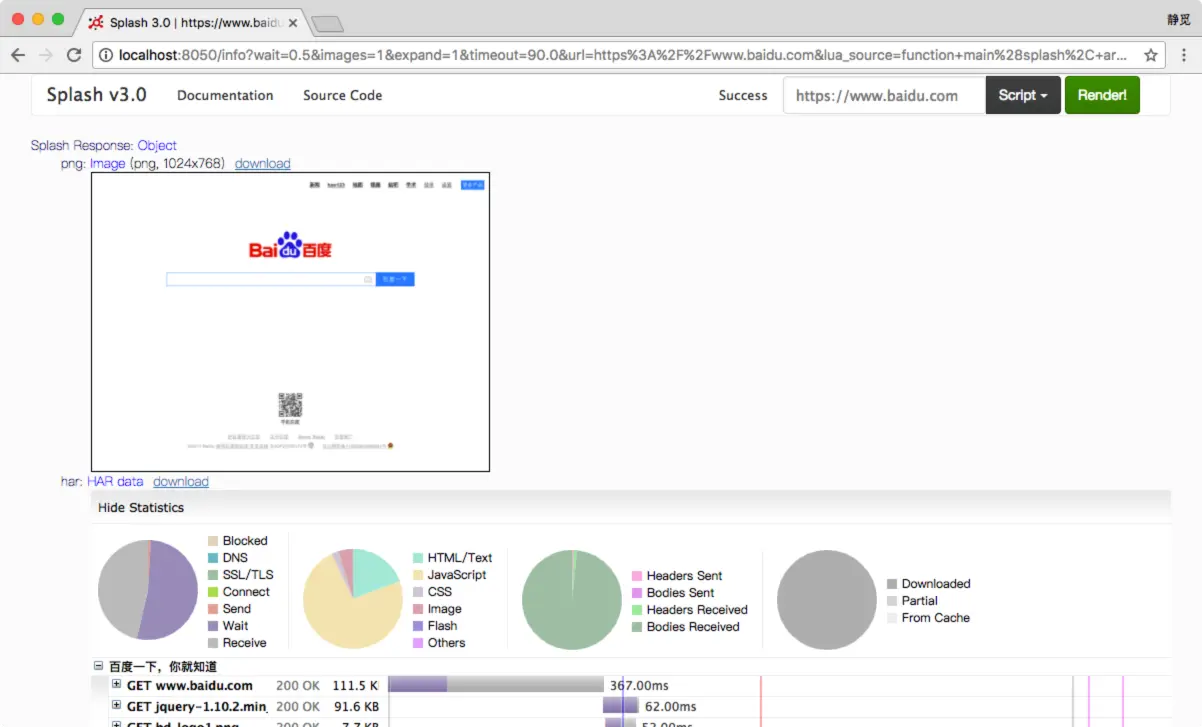 可以看到,网页的返回结果呈现了渲染截图、HAR加载统计数据、网页的源代码。