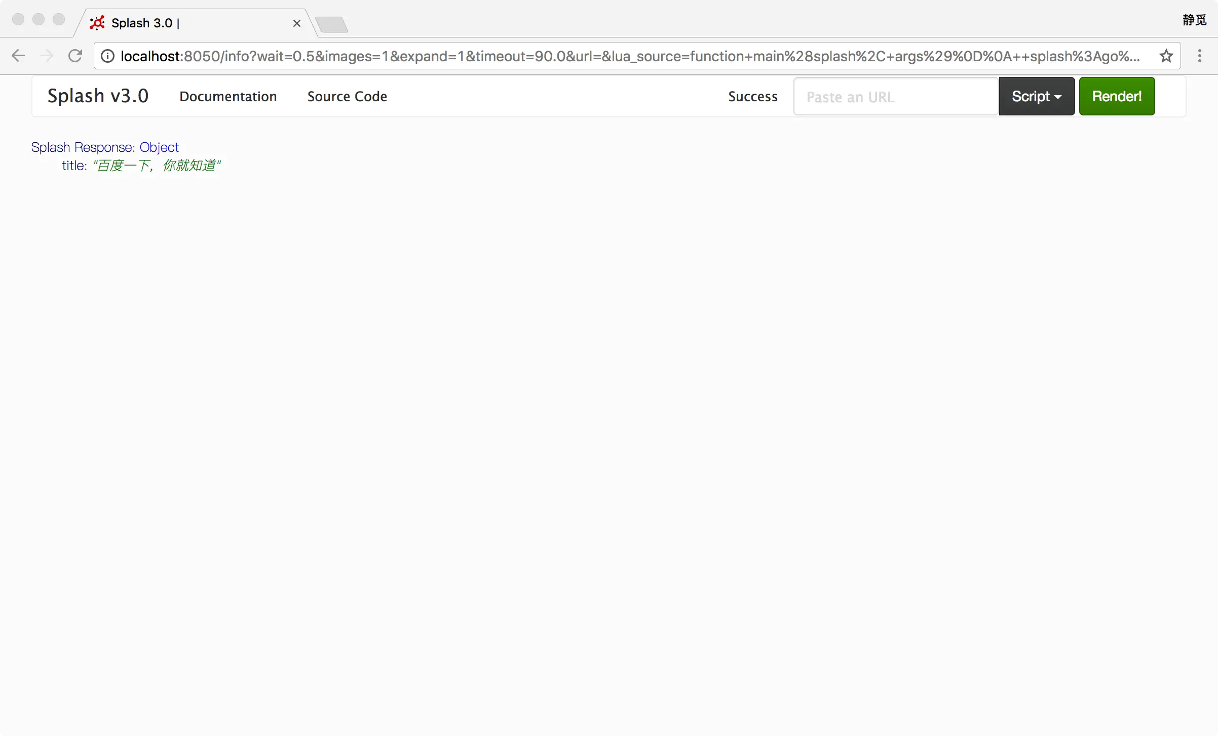 123456function main(splash, args) splash:go("http://www.baidu.com") splash:wait(0.5) local title = splash:evaljs("document.title") return {title=title}end我们将代码粘贴到刚才打开的http://localhost:8050/的代码编辑区域,然后点击Render me!按钮来测试一下。
